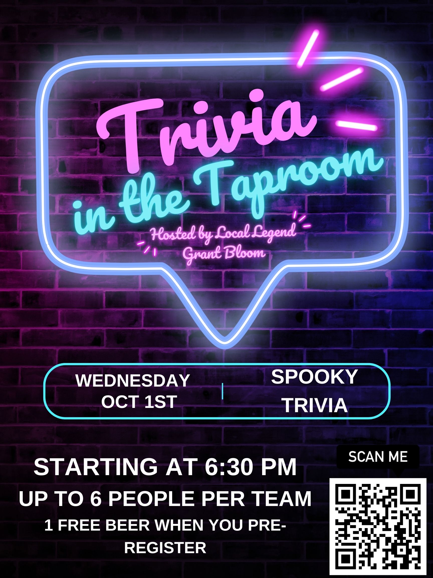 Join us for our monthly Trivia in the Taproom on October 1st! As it will officially be spooky season, we will be having a spooky themed trivia! From horror movies, to Halloween, to real life haunts, come in teams of up to 6 for a spook-tacular night of trivia!